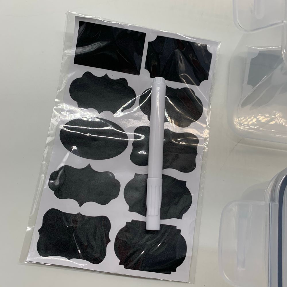 • The package comes with 1 Airtight Food Canister Set; 2pcs extra-small, 2pcs small, 2pcs medium, and 2pcs large canisters with 10 sticker labels and 1 pen.