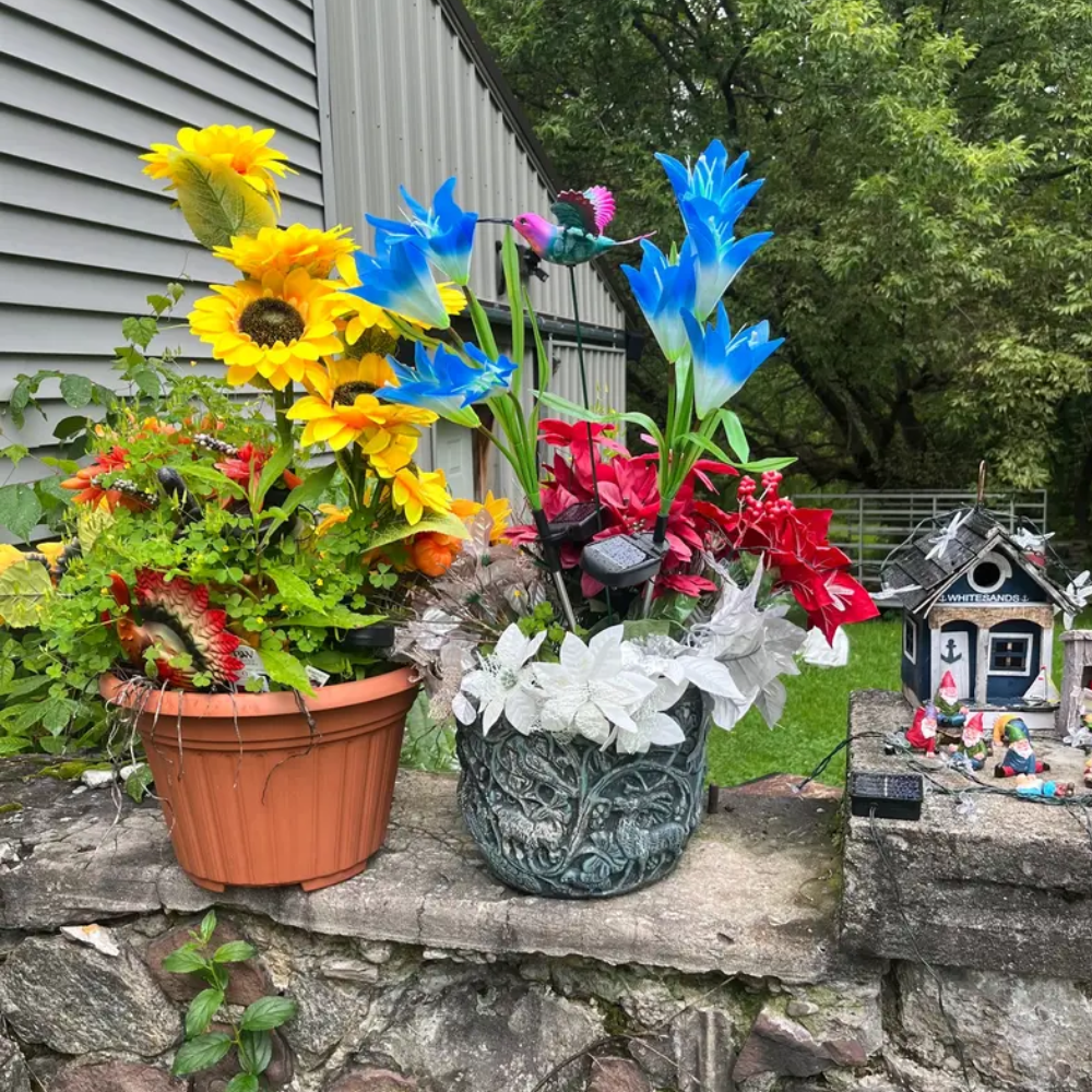 • The package comes with a chosen set of Blossom Glow Garden Lights, solar light panels for each stem, ground anchoring supports, and an instruction manual.